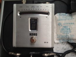 チューナー KORG DT-10。LEDライトで細かく見えるし、感度もいい。繋ぎは2種類あって、アウトプットとバイ...
