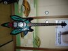 なんか場違いな気もしますが投稿してみました。このギターは安いギターを基に改造・自作したものです。モデルは仮面ライダー響鬼に登場した仮面ライダー斬鬼(ザンキ)の武器、音撃真弦・烈斬です(プロフィールのJUNを開くとご本人画像が見れます)。劇中に出てくるものはギター型の武器ですが、私のはギターとして演奏できるようにしつつも、できるだけ忠実に再現しました。製作は私の職場のNCマシニングで加工して自分で塗装まで仕上げました。製作期間は休みの日だけやって2・3ヶ月くらいでした。音もまずまずでバンドの練習でも積極的に使っています。割と弾き安いのですがカッタウェイが浅いのでハイポジションはきついです。子供には大人気のギターでした。